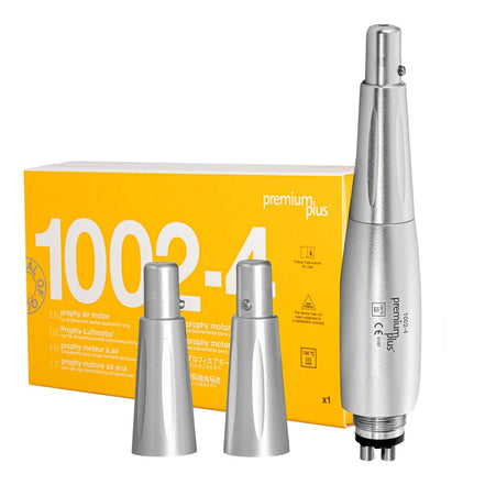 Premium Plus Dental Hygiene Prophy Air Motor Handpiece 4 Holes #1002-4 With 3 Nose Cones. Made in USA. Lightweight and Smooth. 4:1 Reduction 360° Swivel. Ergonomic Design. Autoclavable. Compatible with All Standard Disposable Prophy Angles. FDA Approved. One Year Warranty.